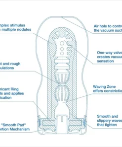 Wewnętrzna, miękka powierzchnia typu softsleeve wykonana z materiału przyjaznego dla skory (TPE) została wyposażona w liczne wypustki, ktore zapewniają rownomierne rozłożenie wibracji oraz komfortowy masaż. Konstrukcja otwarta z obu stron pozwala na szybkie i łatwe czyszczenie oraz zapewnia wygodę użytkowania. Urządzenie jest wodoszczelne, co pozwala na korzystanie z niego rownież w warunkach wilgotnych oraz gwarantuje łatwe utrzymanie higieny.