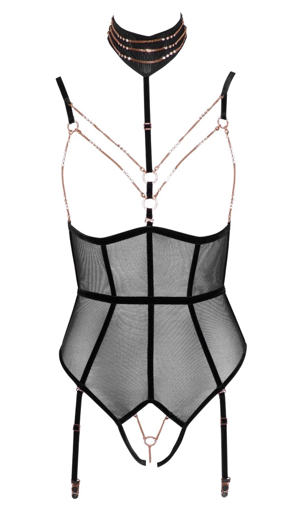 Model wyposażono w regulowane ramiączka oraz szelki, ktore można z łatwością odpiąć, umożliwiając dopasowanie body do indywidualnych preferencji. Dekolt zdobi odpinany naszyjnik z delikatnym łańcuszkiem, zapinany na wygodny guzik. Dodatkowo, ozdobne łańcuszki z małymi karabińczykami na wysokości piersi oraz biżuteryjny łańcuszek w dolnej części podkreślają unikalny charakter produktu. Wszystkie łańcuszki zostały subtelnie ozdobione dżetami, ktore dodają całości wyrafinowanego blasku.