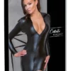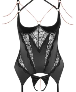 - W zestawie znajdują się pasujące stringi ouvert z elastycznej satyny i odpinanym łańcuszkiem.