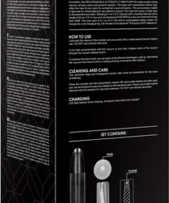 Pompka posiada wbudowany, wydajny akumulator, ktory ładuje się w około 120 minut i pozwala na korzystanie z urządzenia przez nawet 110 minut. Dzięki silnikowi osiągającemu 3700 obrotow na minutę i niskiemu poziomowi hałasu (poniżej 55 dB), model zapewnia komfort i dyskrecję użytkowania. Komora o długości 20 cm i wewnętrznym obwodzie 6,1 cm zapewnia odpowiednią ilość miejsca oraz bezpieczeństwo podczas użytkowania. Urządzenie przeznaczone jest wyłącznie do użytku z lubrykantami na bazie wody. Nie jest wodoodporne.