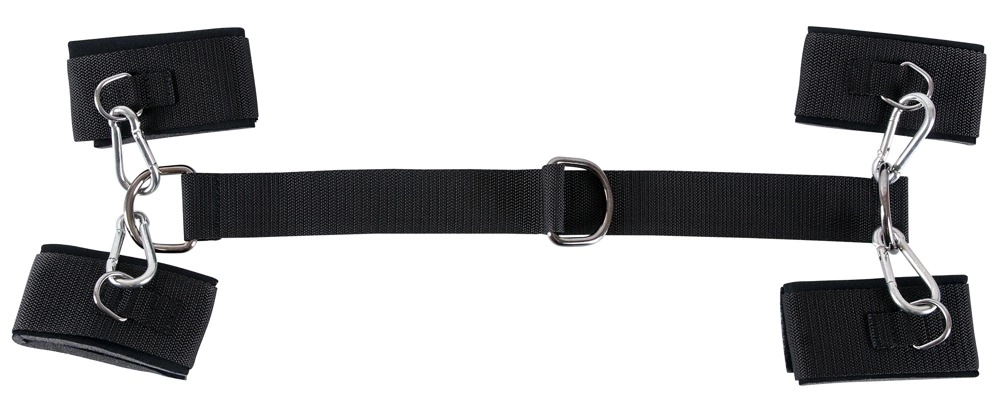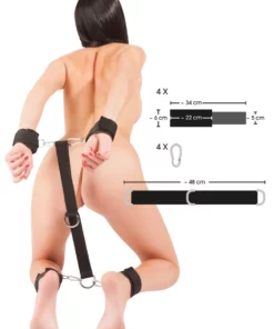 Mankiety wykonano z miękkiego, przyjemnego w dotyku materiału, ktory został dodatkowo wyściełany, aby zapewnić komfort nawet podczas dłuższego użytkowania. Dzięki zapięciom na rzepy model można łatwo dopasować do obwodu nadgarstkow i kostek. Solidna taśma łącząca o długości 43 cm wyposażona jest w centralny metalowy pierścień, umożliwiając szeroki zakres konfiguracji. Karabinki zostały wykonane z ocynkowanego metalu, co gwarantuje trwałość i bezpieczeństwo.