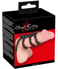 Bad Kitty Kwartet Czarny to innowacyjny zestaw czterech elastycznych pierścieni, połączonych anatomicznie wyprofilowanym prętem o ząbkowanej powierzchni. Produkt został zaprojektowany z myślą o zapewnieniu wsparcia oraz komfortu użytkowania. Wysokiej jakości, elastyczny materiał TPE gwarantuje trwałość i wygodę podczas stosowania, a przemyślana konstrukcja umożliwia łatwe dopasowanie.