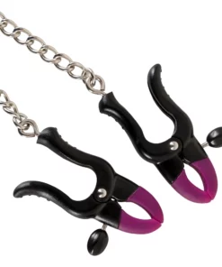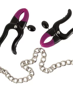 Poznaj wyjątkowy model marki Bad Kitty, zaprojektowany z myślą o osobach poszukujących eleganckich akcesoriow intymnych. Regulowane klipsy na piersi połączone są solidnym, stalowym łańcuszkiem, ktory wyrożnia się srebrno-czarną kolorystyką z efektownymi, fioletowymi elementami wykonanymi z silikonu. To rozwiązanie umożliwia indywidualne dopasowanie siły nacisku za pomocą śruby regulacyjnej, gwarantując komfort użytkowania.
