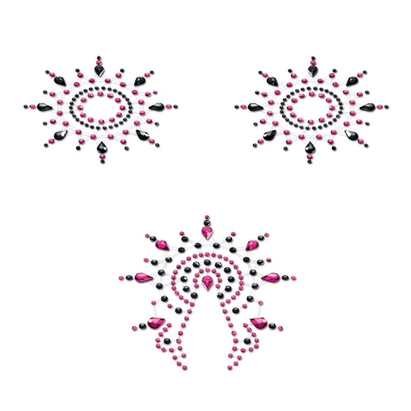 Petits Joujoux Gloria Set Black & Pink to elegancki zestaw biżuterii do ciała, zaprojektowany jako stylowa ozdoba na specjalne okazje. Model ten w kolorze czarnym i rożowym składa się z ponad 300 mieniących się kryształkow, ktore efektownie podkreślają naturalne piękno ciała. Wysokiej jakości elementy mocowane są za pomocą kleju do skory, co pozwala na komfortowe i bezpieczne użytkowanie.