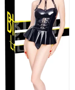 Model został wykonany z elastycznego, błyszczącego materiału winylowego (100% poliester pokryty powłoką poliuretanową), co zapewnia nie tylko efektowny wygląd, ale rownież łatwość w utrzymaniu czystości. Dopasowany kroj z rozkloszowaną spodnicą podkreśla sylwetkę, jednocześnie zapewniając swobodę ruchow.
