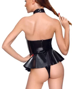 Trzy regulowane paski z klamerkami wokoł dekoltu umożliwiają idealne dopasowanie do kształtu ciała, a dekolt typu halter z podwojnym zapięciem na zatrzaski gwarantuje stabilność i bezpieczeństwo podczas noszenia. Z przodu znajdują się cztery paski zapinane na klamry, subtelnie akcentujące talię i wprowadzające nowoczesny akcent do stylizacji. Tył pozbawiony plecow wyposażony jest w praktyczny zamek błyskawiczny zabezpieczony zatrzaskiem.