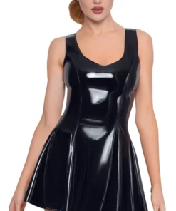 Zintegrowany zamek błyskawiczny z tyłu sprawia, że sukienka jest wygodna do zakładania i zdejmowania, a jednocześnie zachowuje minimalistyczny, nowoczesny charakter. Materiał składa się ze 100% poliestru pokrytego powłoką poliuretanową, co gwarantuje trwałość, łatwość pielęgnacji oraz charakterystyczny, lśniący wygląd.