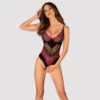 Model ten wyposażono w usztywniające fiszbiny, ktore skutecznie modelują i podtrzymują gorną część sylwetki. Z tyłu zastosowano regulowane sznurowanie, umożliwiające indywidualne dopasowanie oraz akcentujące stylowy charakter produktu. Całość uzupełniają dołączone winylowe stringi w tym samym kolorze, tworząc spojny i efektowny komplet.