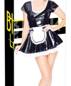 Black Level prezentuje stylową sukienkę inspirowaną klasycznym strojem pokojowki w rozmiarze XL. Model wykonany został z wysokiej jakości materiału winylowego o intensywnym, czarnym połysku, ktory przyciąga wzrok i nadaje całości eleganckiego charakteru. W zestawie znajduje się biały fartuszek z połyskiem oraz subtelne, białe zdobienia z koronki, ktore podkreślają kobiecą sylwetkę.