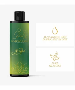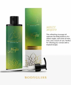 BodyGliss Olejek do masażu i środek poślizgowy Minty Mojito 150ml to innowacyjny produkt 2 w 1, ktory łączy funkcje relaksującego olejku do masażu oraz efektywnego środka poślizgowego. Starannie opracowany w holenderskim laboratorium, wyrożnia się orzeźwiającym aromatem mięty z nutą limonki i subtelnym akcentem rumu, co pozwala stworzyć wyjątkową atmosferę podczas wspolnych chwil.