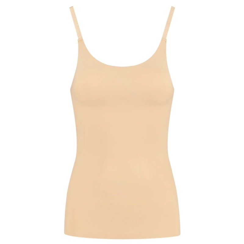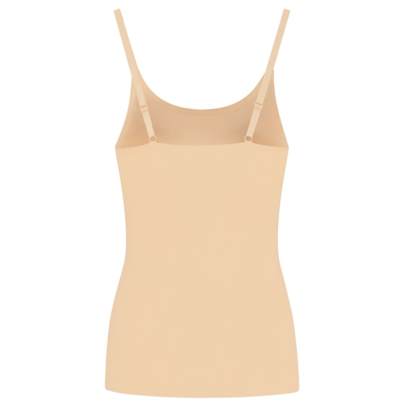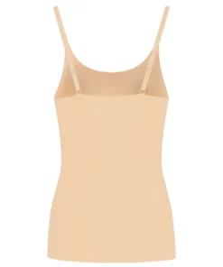 Model posiada cienkie, regulowane ramiączka, ktore pozwalają na indywidualne dopasowanie do każdej sylwetki, a miękka, gładka powierzchnia zapewnia wyjątkową wygodę przez cały dzień. Koszulka sięga do bioder, co gwarantuje stabilność i komfort noszenia. Dzięki subtelnemu, beżowemu kolorowi model doskonale stapia się z odcieniem skory, stanowiąc doskonały wybor pod jasne i dopasowane ubrania.