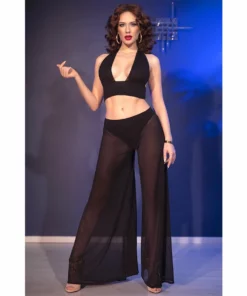 Komplet wykonany został z wysokiej jakości, delikatnie prześwitującej tkaniny, ktora doskonale układa się na sylwetce, subtelnie podkreślając jej atuty. Top umożliwia rożne sposoby wiązania, co pozwala na indywidualne dopasowanie oraz stworzenie unikalnej stylizacji. Spodnie z szerokimi nogawkami zapewniają wygodę, a jednocześnie prezentują się niezwykle modnie i nowocześnie. Całość uzupełniają klasyczne stringi, idealnie dopełniające całość.