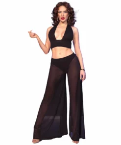 Komplet wykonany został z wysokiej jakości, delikatnie prześwitującej tkaniny, ktora doskonale układa się na sylwetce, subtelnie podkreślając jej atuty. Top umożliwia rożne sposoby wiązania, co pozwala na indywidualne dopasowanie oraz stworzenie unikalnej stylizacji. Spodnie z szerokimi nogawkami zapewniają wygodę, a jednocześnie prezentują się niezwykle modnie i nowocześnie. Całość uzupełniają klasyczne stringi, idealnie dopełniające całość.
