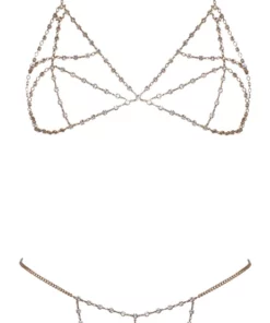 Wyjątkowe bikini łańcuszkowe Cottelli ACCESSOIRES w złotym kolorze to propozycja dla osob ceniących odważny, designerski styl. Model wykonany został z solidnych metalowych łańcuszkow ozdobionych stylowymi dżetami, ktore efektownie prezentują się na ciele, tworząc niepowtarzalny, modny look.