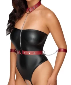 W zestawie znajduje się zdejmowana uprząż w intensywnym, czerwonym kolorze z metalowymi elementami w odcieniu srebra. Obroża oraz pas biodrowy wyposażone są w wygodne zapięcia typu zatrzask, natomiast mankiety zapinane są na rzepy, co umożliwia szybkie dopasowanie do sylwetki oraz komfort użytkowania. Metalowe łańcuchy z karabińczykami można łatwo odczepić, dzięki czemu elementy uprzęży mogą być noszone osobno, według własnych preferencji.