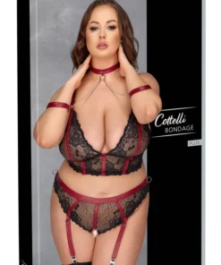 Odkryj stylowy zestaw bielizny od Cottelli Bondage Plus – model 2-częściowy XL, ktory łączy elegancję czarnej elastycznej koronki z kontrastującymi czerwonymi detalami i srebrnymi akcentami. Ten kompletny zestaw, wykonany z wysokiej jakości materiałow, został zaprojektowany z myślą o komforcie i atrakcyjnym wyglądzie.
