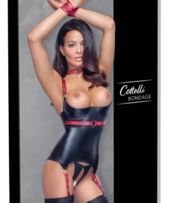 W zestawie znajduje się rownież regulowana obroża z pierścieniem oraz stylowe kajdanki zapinane na zatrzaski, idealnie komponujące się z całością. Wszystkie elementy wykonano z wysokiej jakości materiałow gwarantujących komfort noszenia oraz trwałość użytkowania. Pończochy nie wchodzą w skład kompletu.
