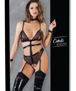 Model wyposażony został w funkcjonalne zatrzaski przy miseczkach oraz wyjmowany łańcuszek krokowy. Dodatkowym atutem są regulowane paski na ramionach oraz dwa paski do pończoch umieszczone z przodu – wszystkie z możliwością odpięcia, zapewniające idealne dopasowanie do sylwetki. W zestawie znajdują się rownież miękkie mankiety na nadgarstki, połączone stylowymi łańcuszkami z karabińczykami (długość 28 cm), ktore łatwo przypiąć do bocznych pierścieni pasa. Całość uzupełnia efektowny kołnierz wet look z pierścieniem z przodu i zapięciem na rzep z tyłu.