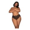 Komplet uzupełniają czarne stringi typu ouvert, ktore wzbogacono o eleganckie wstążki, zapewniając oryginalny i wyrafinowany wygląd. Lekka, przewiewna tkanina sprawia, że bielizna jest komfortowa podczas codziennego użytkowania.