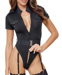 Model marki Cottelli Costumes to starannie wykonane body w klasycznym, czarnym kolorze, zaprojektowane z myślą o efektownym wyglądzie i wygodzie noszenia. Body wyposażono w emblemat na ramieniu, podkreślający stylizację inspirowaną służbami mundurowymi.