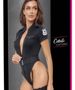 Model marki Cottelli Costumes to starannie wykonane body w klasycznym, czarnym kolorze, zaprojektowane z myślą o efektownym wyglądzie i wygodzie noszenia. Body wyposażono w emblemat na ramieniu, podkreślający stylizację inspirowaną służbami mundurowymi.