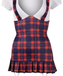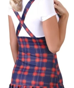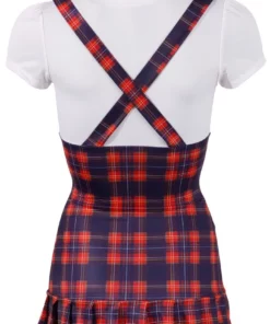 Model ten został zaprojektowany z myślą o komforcie i atrakcyjnym wyglądzie. Sukienka imituje klasyczny mundurek szkolny i składa się z białej bluzki z krotkim rękawem, kołnierzykiem oraz niskim dekoltem, połączonej z kolorową, plisowaną spodnicą w niebiesko-czerwoną kratę. Szerokie ramiączka krzyżują się na plecach, zapewniając wygodne dopasowanie i ciekawy akcent wizualny. Przod zdobią dwa białe szelki, ktore efektownie podkreślają całość stylizacji.