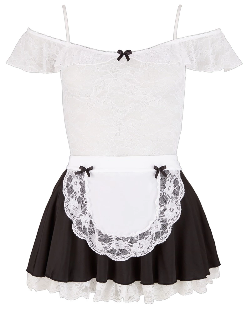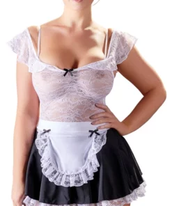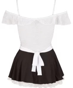 Kostium uzupełnia biały fartuszek, ktory można wygodnie zawiązać wokoł talii. Komplet idealnie sprawdzi się podczas imprez tematycznych, karnawału czy wyjątkowych wieczorow w domowym zaciszu.