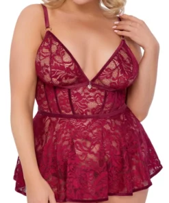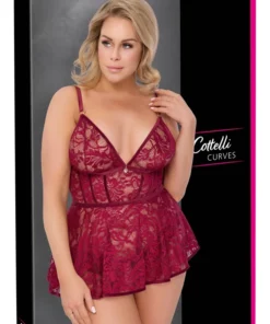 Elegancki komplet nocny Cottelli Curves – babydoll z koronką i bezkrokowe majtki, rozmiar XL, kolor ciemnoczerwony