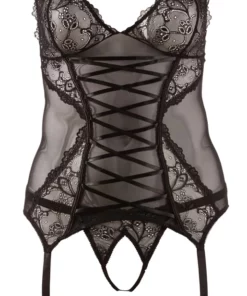 W komplecie znajdują się rownież stringi z tej samej subtelnej koronki, wyrożniające się otwartą konstrukcją w kroku dla podkreślenia nowoczesnego stylu. Zestaw nie zawiera pończoch.