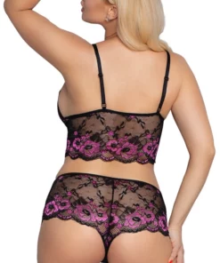 Biustonosz posiada przedłużony fason oraz elastyczne paski podkreślające linię miseczek. Regulowane ramiączka umożliwiają indywidualne dopasowanie długości, a zabudowany kroj majtek z wysokim stanem zapewnia doskonałe dopasowanie oraz elegancki wygląd. Całość utrzymana jest w ponadczasowej, czarnej kolorystyce, ktora podkreśla uniwersalny charakter kompletu.