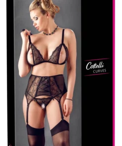 Model składa się z miękkiego biustonosza z otwartą konstrukcją miseczek, wyposażonego w regulowane ramiączka oraz praktyczne zapięcie na haftki z tyłu. W zestawie znajduje się rownież szeroki pas do pończoch z dekoracyjnym sznurowaniem z przodu oraz czterema regulowanymi paskami, ktore umożliwiają idealne dopasowanie do indywidualnych potrzeb. Całość uzupełniają stylowe, dopasowane stringi, ktore tworzą harmonijną całość z resztą kompletu.