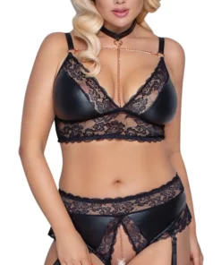 W zestawie znajduje się biustonosz z dekoracyjnymi łańcuszkami, ktore można w łatwy sposob odpinać dzięki praktycznym zapięciom na rzepy. Figi typu ouvert posiadają efektowne wycięcia i subtelny, ozdobny łańcuszek. Regulowane szelki umożliwiają dopasowanie do sylwetki, a sam komplet doskonale podkreśla kształty.