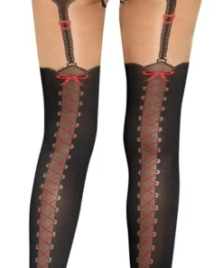 Jedwabiście gładki materiał gwarantuje komfort noszenia oraz perfekcyjne dopasowanie do sylwetki. Starannie wykonane zdobienia sprawiają, że rajstopy prezentują się niezwykle stylowo i przyciągają uwagę. Otwarta część w kroku oraz wyraźnie zaznaczone, dekoracyjne sznurowanie nadają całości niepowtarzalnego charakteru.
