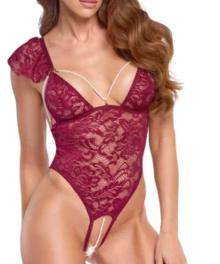 Odkryj wyjątkowy model body marki Cottelli Lingerie, zaprojektowany z dbałością o każdy detal. Ta elegancka propozycja w kolorze głębokiego bordo wyrożnia się starannie wykonaną, miękką koronką o kwiatowym wzorze oraz subtelnymi, białymi łańcuszkami z pereł, ktore dodają całości wyrafinowanego charakteru. Projekt podkreślają efektowne ramiączka z koronki, a także detale w odcieniu rożowego złota.