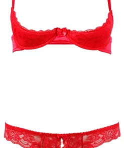 Zestaw uzupełniają stringi z oryginalnym wycięciem z przodu, ktore dodają całości wyrafinowania. Czerwony kolor podkreśla elegancję oraz ponadczasowy styl kompletu, a wysokiej jakości materiały zapewniają trwałość oraz wygodę użytkowania.