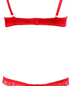 Prezentujemy efektowny czerwony zestaw marki Cottelli Lingerie, ktory zachwyca subtelnym połączeniem kwiatowej koronki oraz połyskującej satyny. Model składa się z biustonosza bez miseczek na regulowanych ramiączkach oraz otwartych stringow z dekoracyjnym wycięciem w przedniej części. To doskonałe rozwiązanie dla osob ceniących sobie wysoką jakość wykonania oraz oryginalne, wyrafinowane wzornictwo.