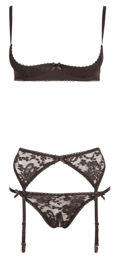 - W zestawie: stanik z fiszbinami z lekko usztywnianymi miseczkami, pas do pończoch, otwarte figi typu Riostring
