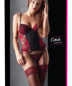 Elegancki zestaw bielizny od renomowanej marki Cottelli Lingerie to połączenie klasycznej estetyki z nowoczesnym wykonaniem. Komplet składa się z kunsztownie zdobionego gorsetu o kwiatowym wzorze oraz dopasowanych stringow, ktore wspolnie tworzą harmonijną i stylową całość. Model wykonany został z wysokogatunkowego materiału typu powernet, w połączeniu z delikatną koronką, dzięki czemu zapewnia komfort i trwałość użytkowania.