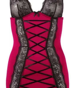 Cottelli Lingerie prezentuje elegancką sukienkę w kolorze intensywnej czerwieni z wyrafinowanymi czarnymi koronkowymi akcentami. Model ten przyciąga uwagę precyzyjnym sznurowaniem z przodu oraz kontrastowymi wstawkami z delikatnej koronki umieszczonymi przy dekolcie, na brzuchu i u dołu, co nadaje całości wyjątkowego charakteru. Regulowane paski pozwalają na indywidualne dopasowanie, gwarantując komfort noszenia oraz podkreślenie sylwetki. Sukienka została wykonana z wysokiej jakości materiałow, ktore są miękkie i przyjemne w dotyku, a jednocześnie odporne na rozciąganie i utratę kształtu.