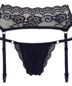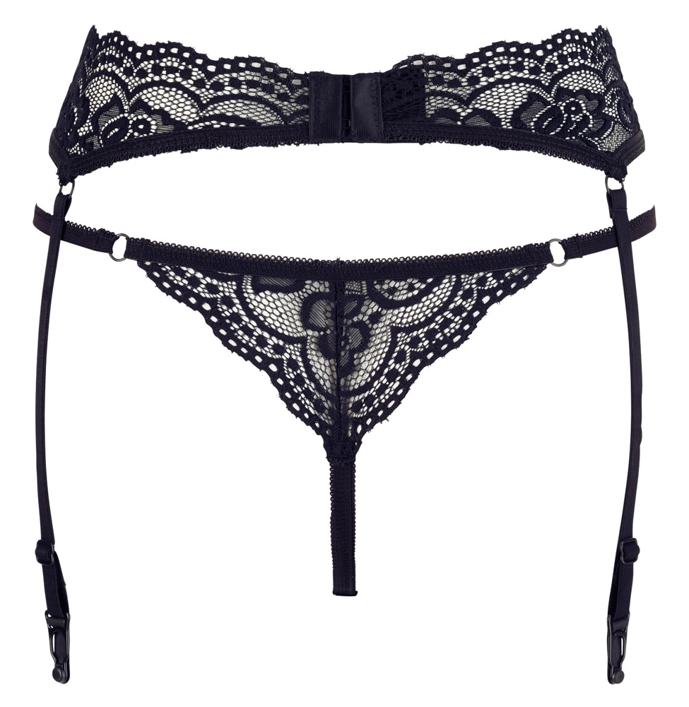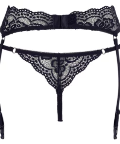 Cottelli Lingerie XL – Wyjątkowy komplet bielizny z koronkowym pasem do pończoch i stringami w eleganckim, czarnym kolorze.