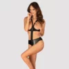 Zestaw obejmuje miękki biustonosz oraz majtki z otwartą konstrukcją, wykonane z wysokiej jakości, elastycznego materiału o połyskującej powierzchni wet look. Całość wyrożnia się modnym krojem oraz subtelnymi detalami w kolorze rożowego złota, ktore nadają całości eleganckiego wykończenia.