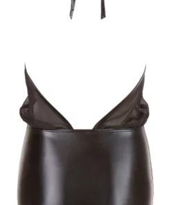 Sukienka posiada elastyczny doł wykonany z tkaniny o połyskującym wykończeniu typu „wetlook”, ktory podkreśla sylwetkę i nadaje całości nowoczesny charakter. Gora modelu została uszyta z delikatnej, transparentnej siateczki, ktora tworzy intrygujący kontrast z dolną częścią. Szeroki kroj gornej części oraz wiązany na szyi uchwyt pozwalają na indywidualne dopasowanie i wygodę noszenia. Tył pozostaje częściowo odkryty, co nadaje kreacji lekkości.