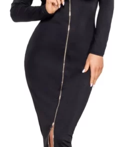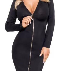 Najważniejszym atutem tej sukienki jest złoty, dwukierunkowy zamek na całej długości przodu. Praktyczne rozwiązanie pozwala regulować sposob noszenia, zapewniając komfort i swobodę ruchu. Wysokiej jakości, elastyczny materiał z przewagą poliestru i dodatkiem spandexu miękko otula ciało, gwarantując wygodę nawet przez wiele godzin.