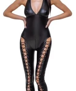 - Model: Czarny matowy kombinezon ze sznurowanymi nogawkami