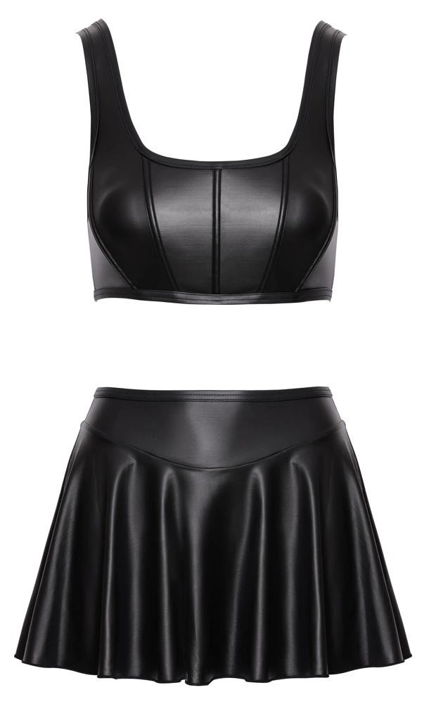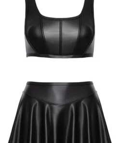 Podkreśl swoją sylwetkę z wyjątkowym zestawem marki Cottelli PARTY. Ten komplet składa się z krotkiego topu typu gorset oraz rozkloszowanej mini spodnicy, wykonanych z nowoczesnego, matowego materiału w głębokim odcieniu czerni. Całość została zaprojektowana z myślą o wygodzie i doskonałym dopasowaniu do ciała.