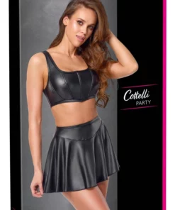 Podkreśl swoją sylwetkę z wyjątkowym zestawem marki Cottelli PARTY. Ten komplet składa się z krotkiego topu typu gorset oraz rozkloszowanej mini spodnicy, wykonanych z nowoczesnego, matowego materiału w głębokim odcieniu czerni. Całość została zaprojektowana z myślą o wygodzie i doskonałym dopasowaniu do ciała.