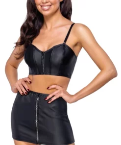 Na szczegolną uwagę zasługuje efektowny zamek błyskawiczny na całej długości z przodu, ozdobiony połyskującymi dżetami od gory do dołu. Spodniczka posiada elastyczny pas, ktory zapewnia wygodę i swobodę ruchow, a miękki, lekko elastyczny materiał idealnie układa się na ciele.