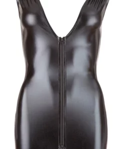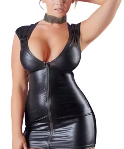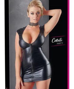Odkryj wyjątkowy styl z marką Cottelli PARTY! Prezentujemy krotką sukienkę mini w klasycznej czerni, wykonaną z efektownego, połyskującego materiału typu wet look. Ten model to propozycja dla osob poszukujących nowoczesnych i przyciągających wzrok rozwiązań na specjalne okazje. Sukienka wyrożnia się dopasowanym krojem, ktory podkreśla sylwetkę oraz głębokim dekoltem z przodu, nadając całości eleganckiego charakteru.