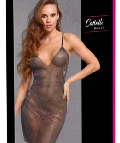 Sukienka została wykonana z transparentnej, czarnej siateczki, ktora została bogato ozdobiona wielokolorowymi, połyskującymi kryształkami. Precyzyjnie rozmieszczone ozdoby sprawiają, że całość mieni się i przyciąga spojrzenia. Regulowane, wąskie ramiączka oraz głęboki dekolt w kształcie litery V nie tylko podkreślają sylwetkę, ale rownież zapewniają wygodę i możliwość idealnego dopasowania do figury.