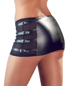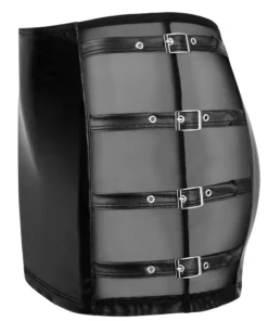Odkryj wyjątkowy model mini spodniczki marki Cottelli, zaprojektowany z myślą o osobach poszukujących odważnej stylizacji na wyjątkowe okazje. Ta czarna mini spodniczka wyrożnia się nowoczesnym fasonem podkreślającym sylwetkę, a jej głownym atutem są efektowne, przezroczyste wstawki z siateczki po bokach. Dodatkowe cztery ozdobne paski z klamrami umieszczone powyżej siateczkowych paneli dodają całości niepowtarzalnego charakteru. Elastyczny materiał zapewnia wygodę noszenia oraz idealne dopasowanie do ciała.